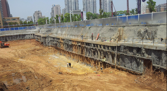 工程特點:項目位于武昌區武珞路老武鍋內,設置二層滿鋪地下室,開挖深度9.70m~15.50m,周長380m,面積8500m2。